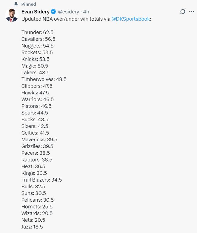 北京时间10月8日,美媒DKSportsbook预测了联盟30支球队的战绩情况: